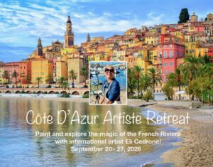 Paint and explore the magic of the French Riviera with Eli Cedrone! We’ll explore creative techniques, learn fundamentals of landscape and figure painting, and spend time developing your artistic voice in a supportive, energizing environment. September 20-27, 2026