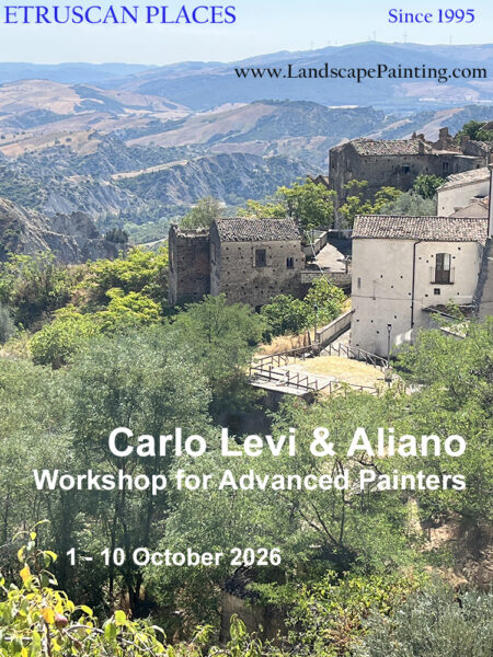 In this one-time collaborative effort with Museums of Aliano (MuA) advanced painters will have the opportunity to stay in MuA’s artist residency spaces while working in the stunning landscapes of Aliano in Italy’s southern province of Matera. Aliano is most famously associated with Carlo Levi, one of Italy’s most important intellectual and cultural figures of the 20th century. Painter, writer and social activist, his international best seller “Christ Stopped at Eboli” was based on Levi’s experiences in Aliano in 1935-36. Many of his most important paintings were executed during this period. Artists will work in the town, local landscape and other destinations. Lectures and museum visits will be organized by the MuA staff. 2 artist organizers will work directly with participants each day. Daily reviews. Exhibition of work at program conclusion. Fees include accommodation, breakfast, dinner, 1 pick up and drop off in Naples, local transportation, field trips (Craco, Matera, Pietrapertosa, Pisticci), museums. 212-388-9832 WhatsApp 39-347-143-40-36